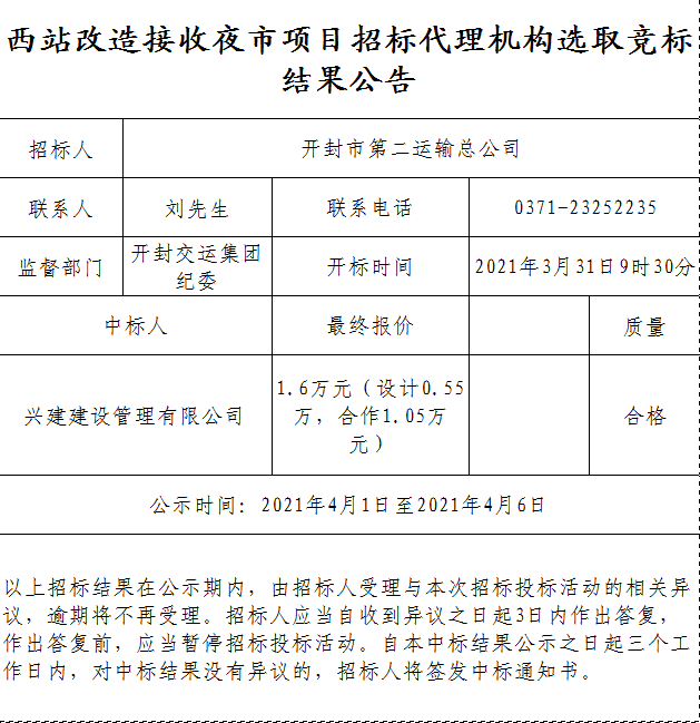 西站改造接收夜市項目招標代理機構選取競標結果公告